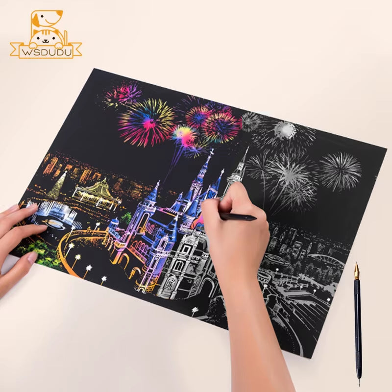 No imaginaba que rascar estas láminas pudiera ser tan terapéutico. Me ayuda a relajarme después del trabajo, y los diseños de monumentos del mundo son espectaculares. Lo recomiendo 100% tanto para adultos como para niños.Andrés R.